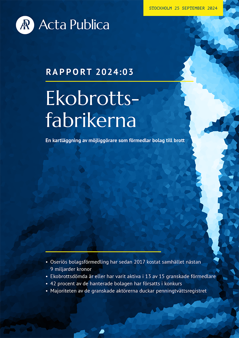 Ekobrottsdömda är eller har varit aktiva i 13 av 15 granskade förmedlare. Bolag har förmedlats till storskalig ekonomisk brottslighet och till personer med kopplingar till grov organiserad brottslighet och extremism. 42 procent av de hanterade bolagen är nu försatta i konkurs och bolagen har skulder som uppgår till 8,8 miljarder kronor.