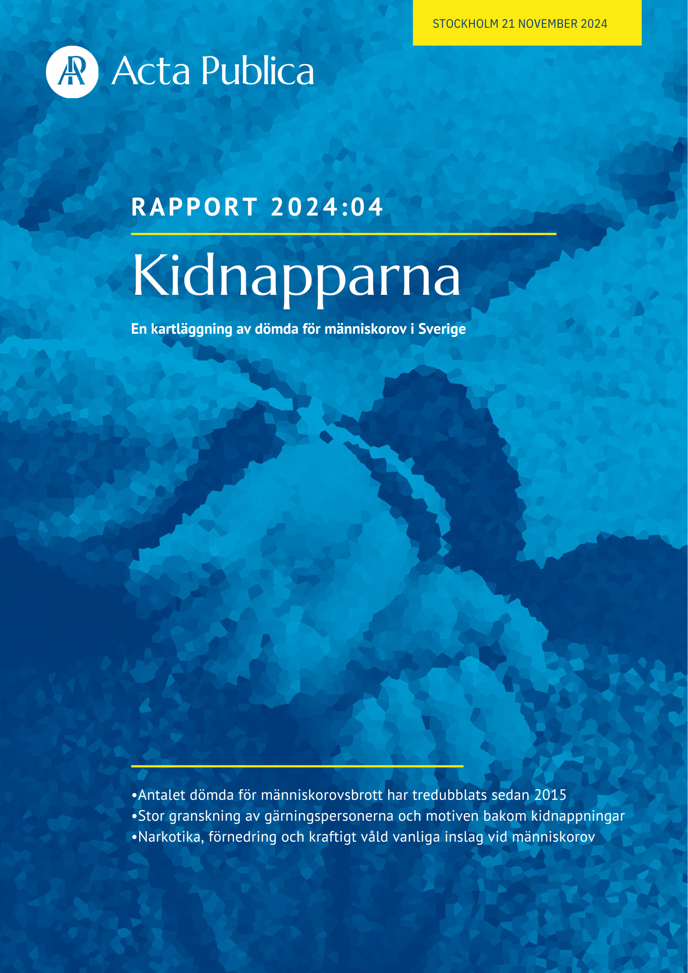 Rapporten innehåller också en kartläggning av dem som har dömts för människorovsbrott, bland annat avseende deras koppling till kriminella grupperingar, samt en analys av de vanligaste motiven till kidnappningar.